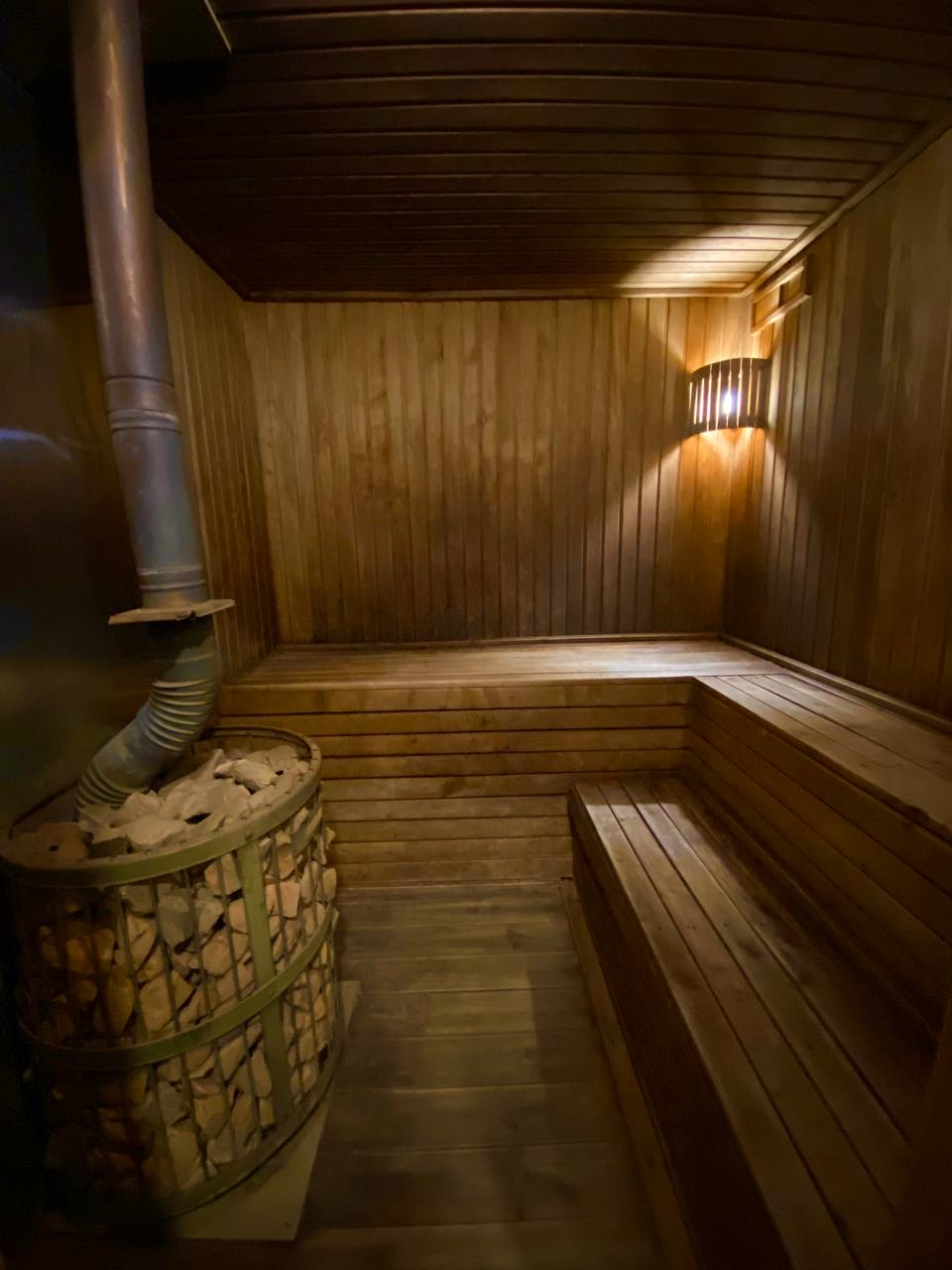 Затишна 6-місна Баня на дровах (з можливістю відпочинку до 8 гостей) з панорамним видом на річку Дніпро. Має власну терасу з мангалом (дрова у вартість не входять), яка для вашого комфорту в холодну пору року з усіх сторін зачиняється м’якими вікнами. Чудове місце, щоб зігрітись та поспілкуватись з друзями. На ваш вибір є відро, душ, басейн або можливість пірнання у річку. Діапазон температури в бані від 70*С до 120*С по бажанню. Велика кімната відпочинку.