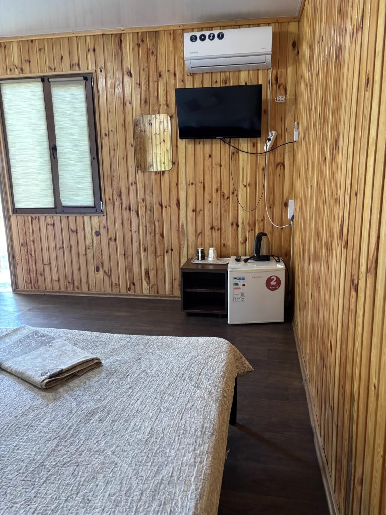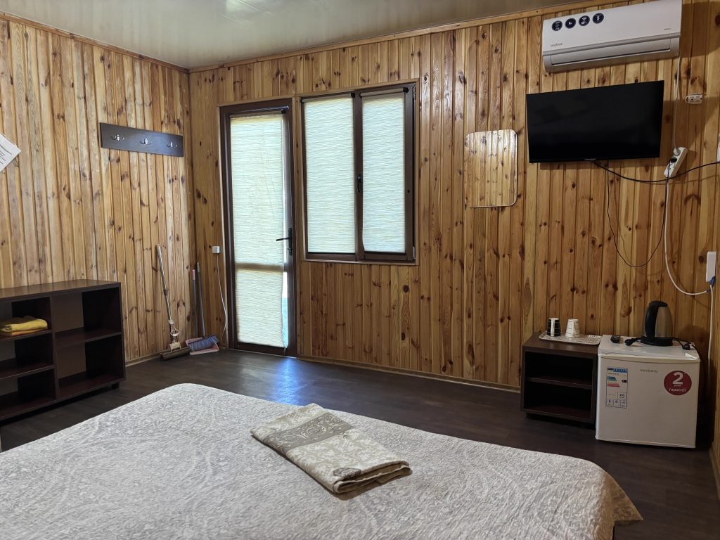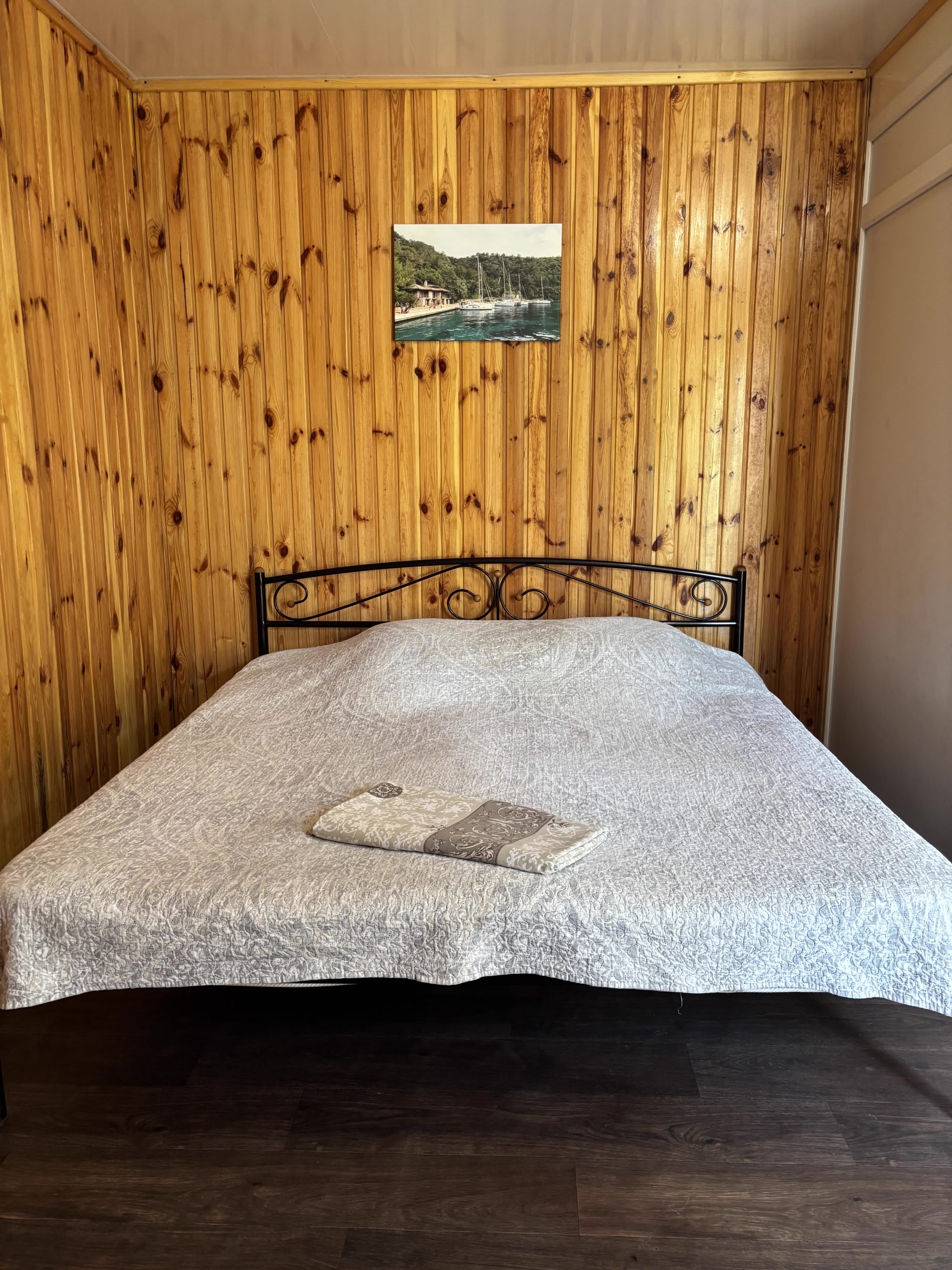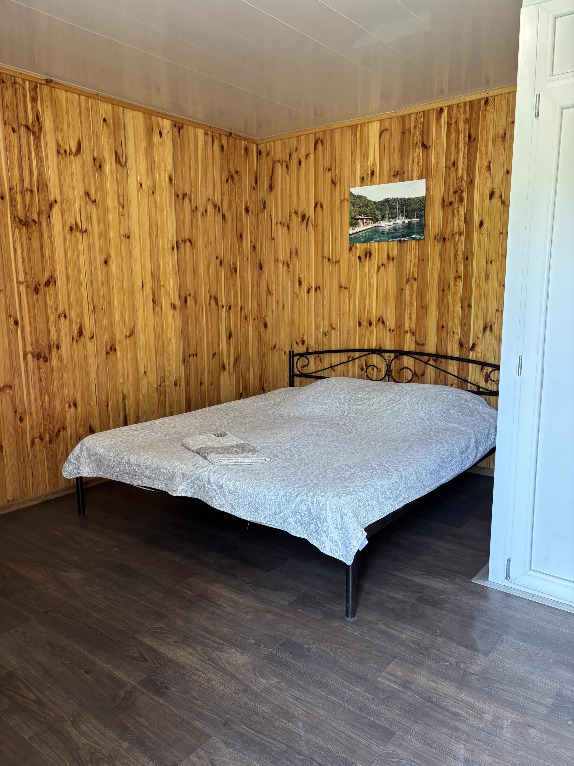 Будиночок 2-місний (з можливістю підселення 1 людини – додаткове місце – євро розкладачка на ламелях з матрацом). В будинку велике 2-х спальне ліжко, кондиціонер, телевізор, невеликий холодильник, електрочайник, санвузол. Поруч невелика альтанка+мангал (входять у вартість, дрова у вартість не входять).