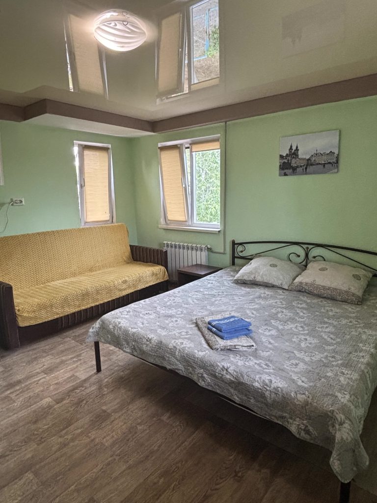 Номер 2-місний (з можливістю підселення 2 людей) розташований на другому поверсі. В номері велике 2-х спальне ліжко + розкладний диван. В номері є кондиціонер, телевізор, невеликий холодильник, електрочайник, мікрохвильова піч, санвузол. Номер має терасу з видом на залив річки Дніпро. Поруч альтанка+мангал (входять у вартість, дрова у вартість не входять).