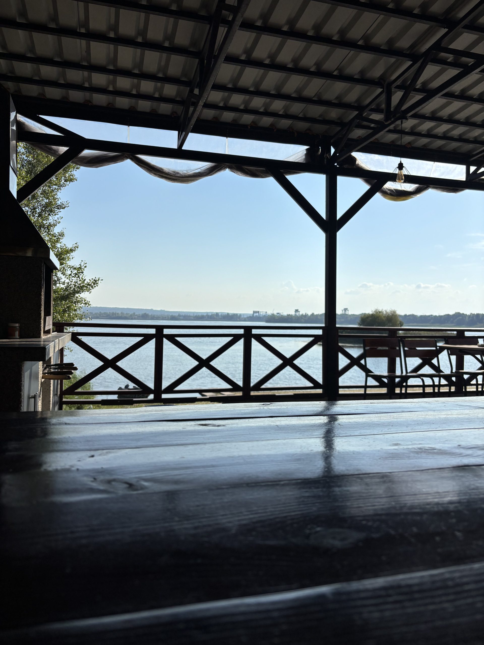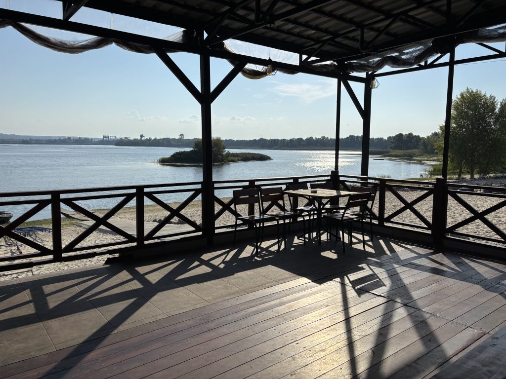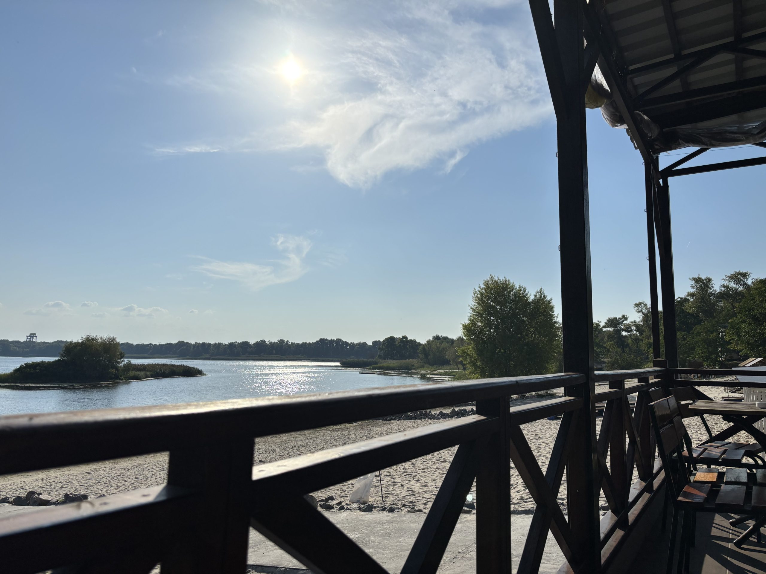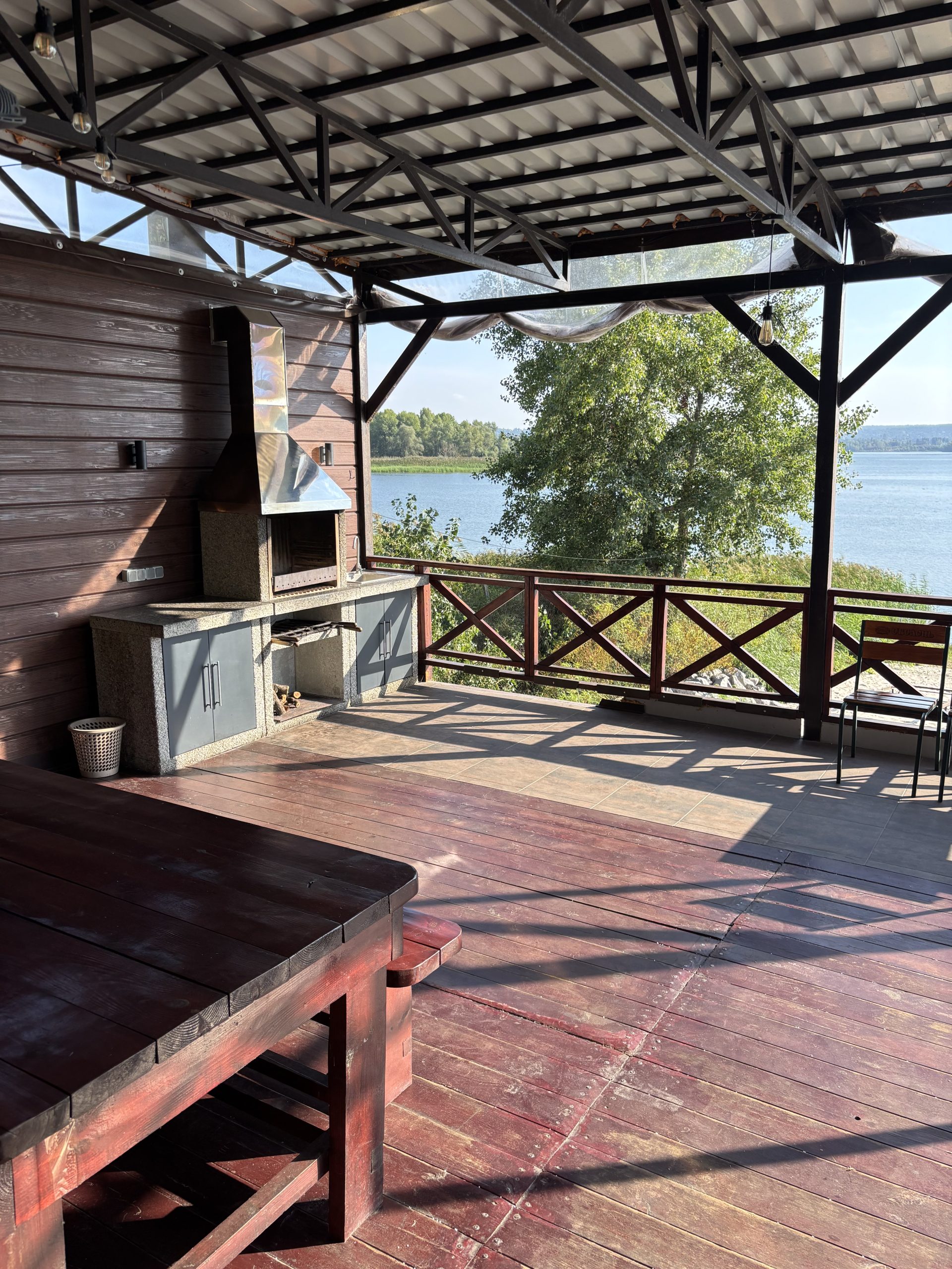 Велика 12-місна Тераса на березі (з можливістю відпочинку до 20 гостей) з чудовим видом на широку річку Дніпро. Облаштована всім необхідним для комфортного вашого відпочинку. Вода, розетки, освітлення, великий дерев’яний стіл, мангал (дрова у вартість не входять). В холодну, вітряну погоду з усіх сторін зачиняється м’якими вікнами.